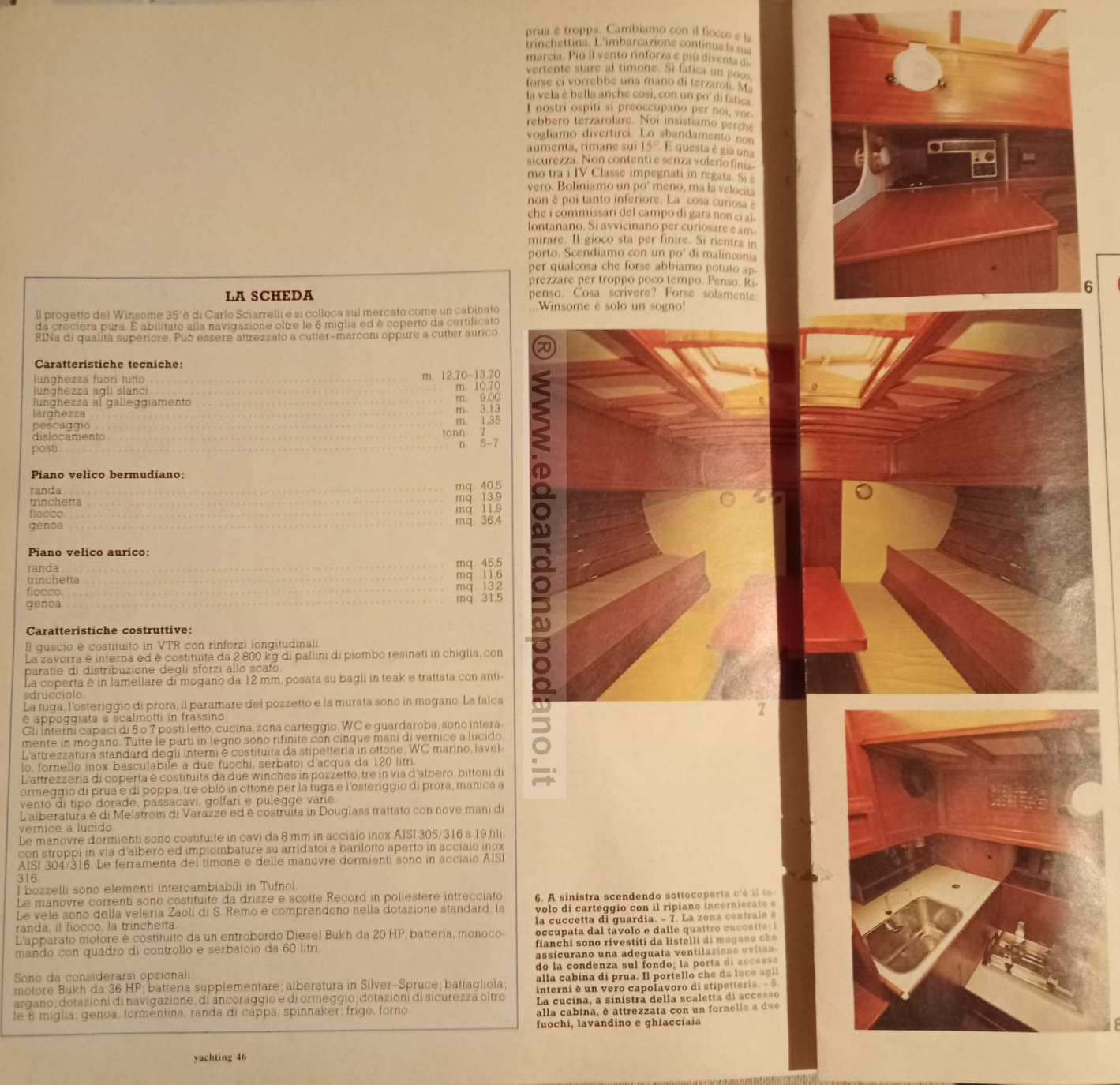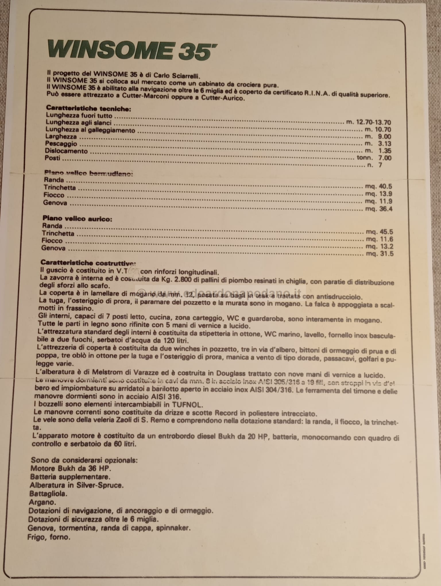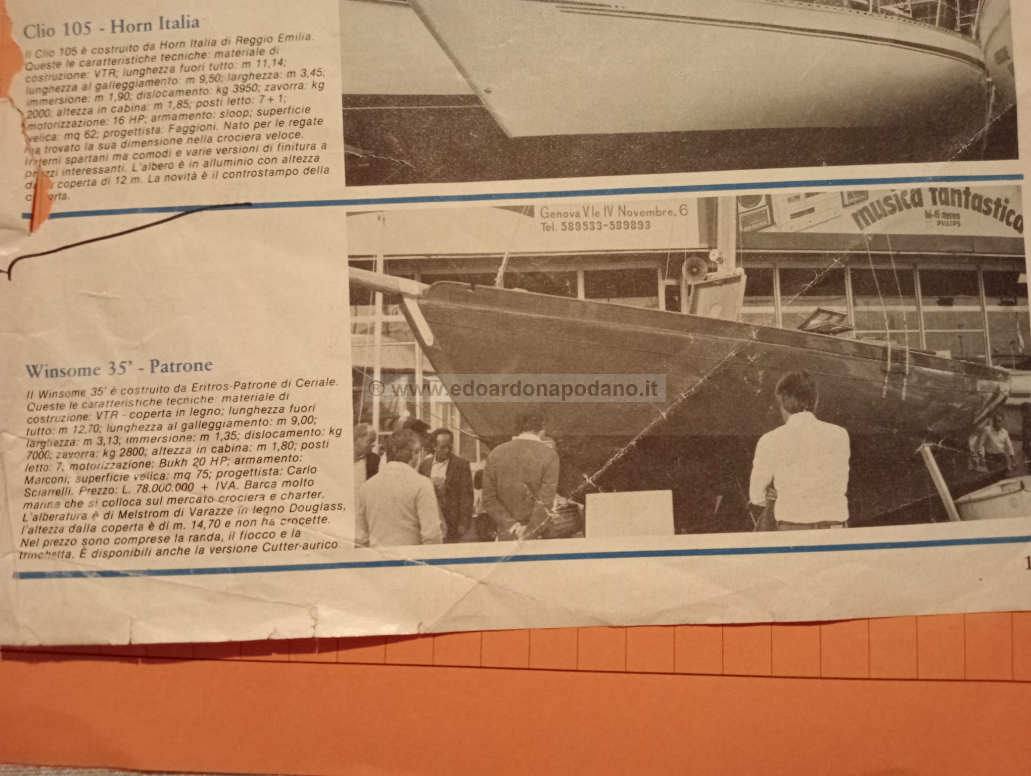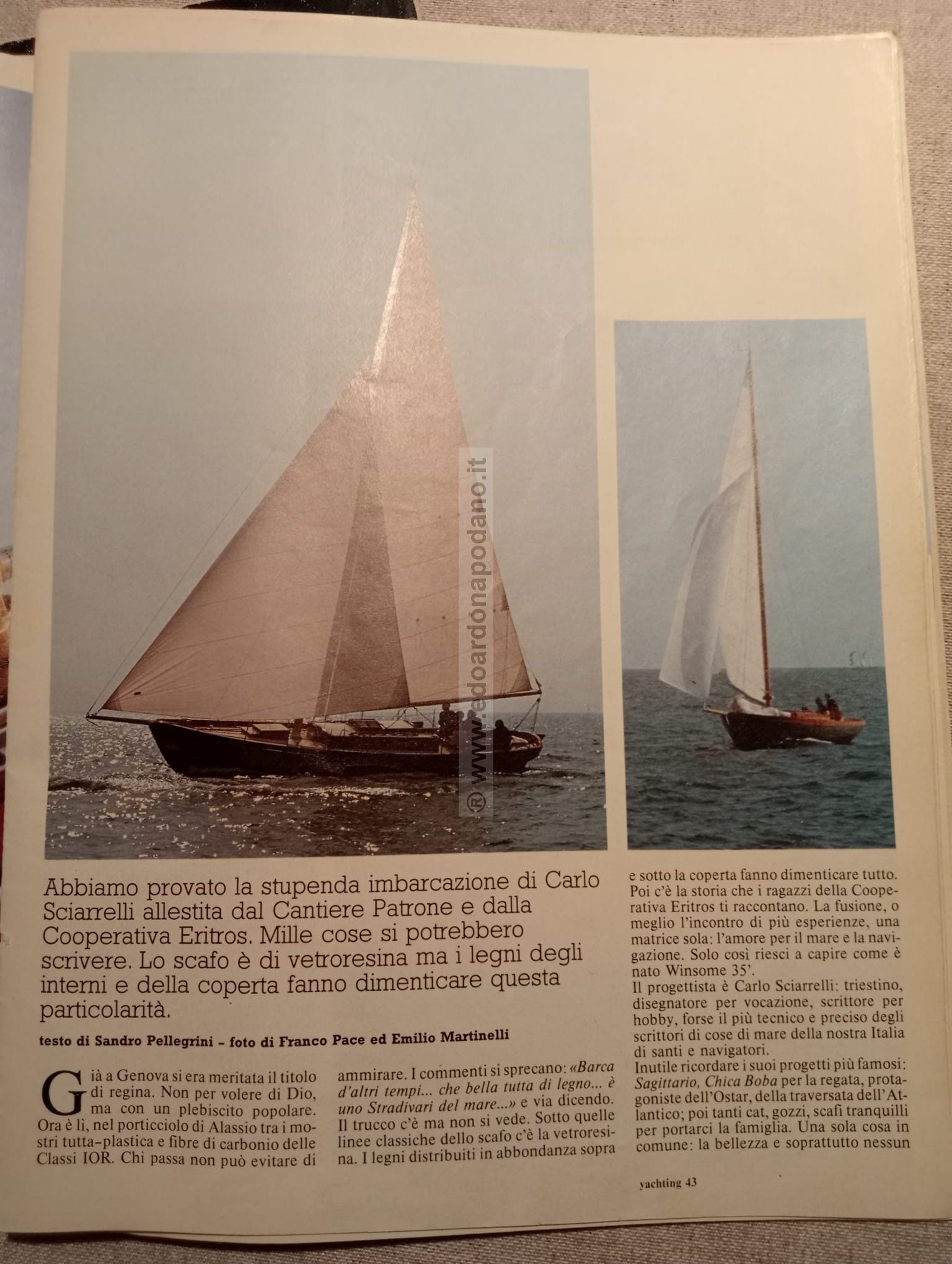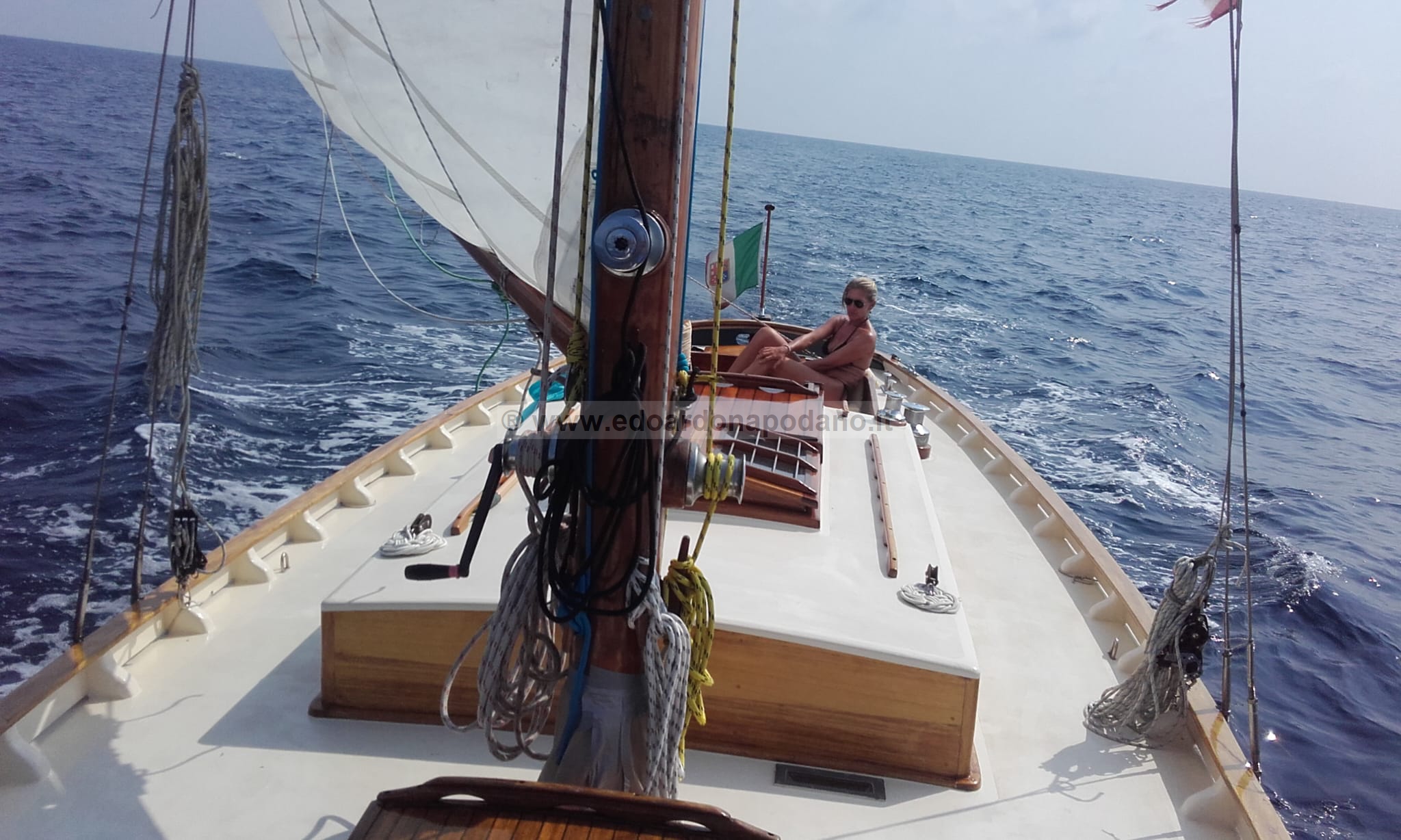 Year 1983 Total Refitting 1999 - good condition Builder Patrone Designer Carlo Sciarrelli Loa 10,70 m Hull Fiberglass Engine Lombardini LDW 1404 (1134 h) Teak deck Mahogany/teak interior Flag ITA Sails:mainsail, jib, genoa, gennaker, storm jib. Interior: from cockpit going inside, galley on the left, chart table on the right; ward-room with 4 berth and central removable table; toilette on left, wardrobe on right; owner cabin on the bow with 2 berths; storeroom extreme bow. Fridge Windlass Battery charger and batteries: new