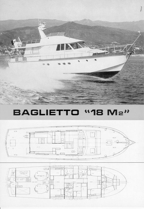 Restoration needed but easy to launch Some pics available – boat well recovered Baglietto 18 M2 Loa 17,68 m Beam 4,90 m Displ 40,73 t Cabins 3 + crew Wc 3 + crew Engines 2 X GM 675 CV mod 12V71T – 1973 Download PDF