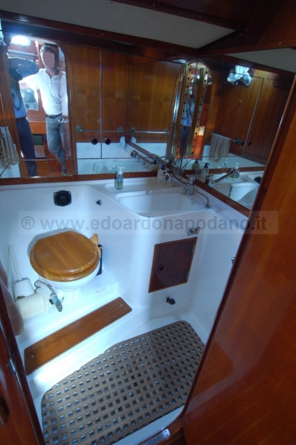 PLUMBING SYSTEM: Water capacity 1570 liters in five stainless steel tanks – Idromar stainless steel 230v desalination unit producing 190 l/h – 40 liter hot water heater (220v) – Fresh water deck wash pump – Sink/shower in each head – Hot/cold deck shower.