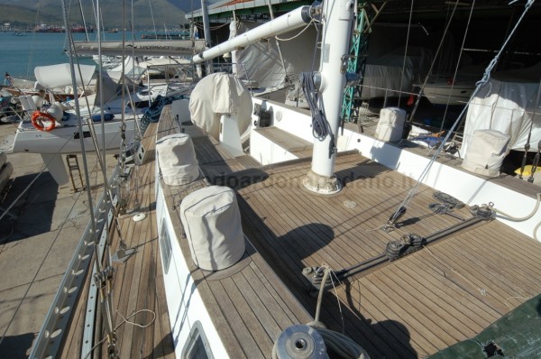 DECK: Deck in GRP sandwich construction – Deck is finished in white gel coat with blue coaming stripes – Teak deck was laid in 1997 at Serigi Shipyard in Italy – Toe Rail in anodized aluminum (replaced in 2009) – Stainless steel wheel, 112cm diameter, with 2.6mm chrome dressed leather (new leather 2009) – Electric anchor windlass with capstan – 1 x CQR anchor (regalvanized in 2010) – 1 x Danforth anchor (regalvanizing in 2010) – 100m of 14mm stainless steel anchor chain – 12” aluminum mooring cleats, 2 on the bow, 2 amidships and 2 on the stern – Stainless stanchions and lifelines with gates amidships on both sides – Stainless bow pulpit and pushpit with gate and flag staff holder – Stainless handrails around main mast – Ventilated gas locker – Deck was reinforced to accommodate larger winches and pedestals in 2006 – Deck prisms replaced in 2009 – Opening hatches in all cabins, galley and saloon – All Goiot deck hatches replaced in 2006.