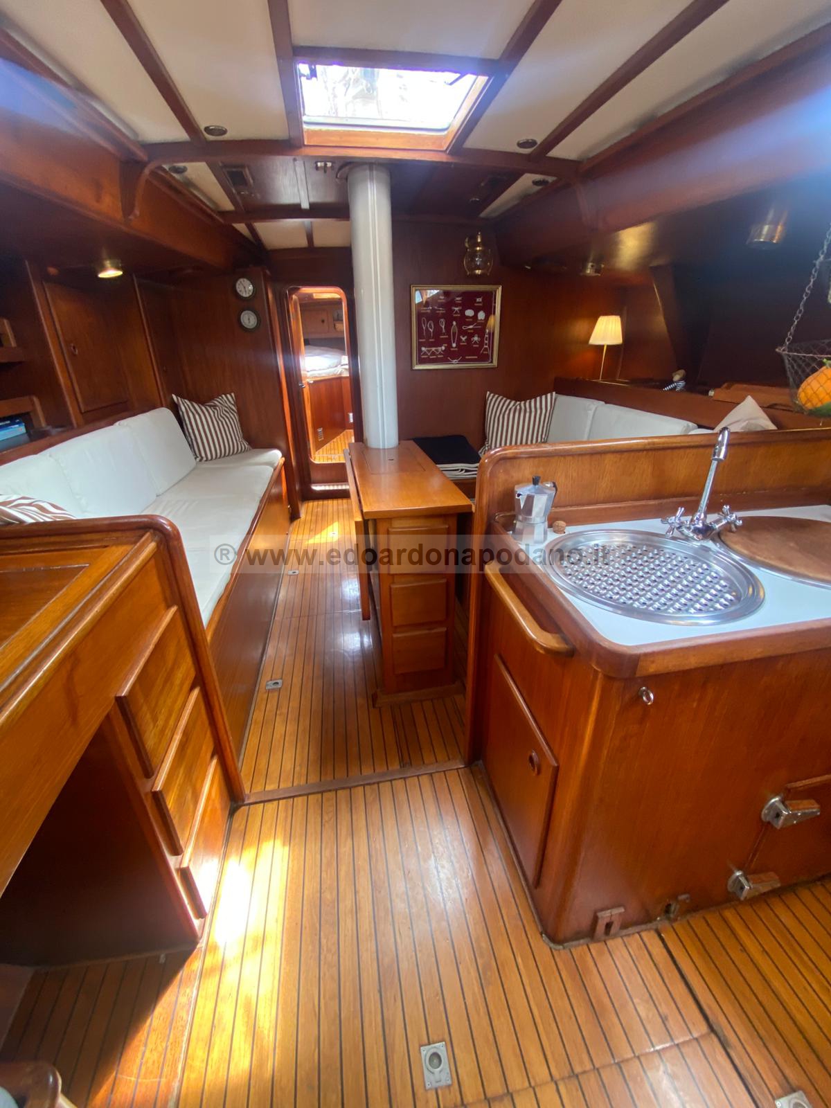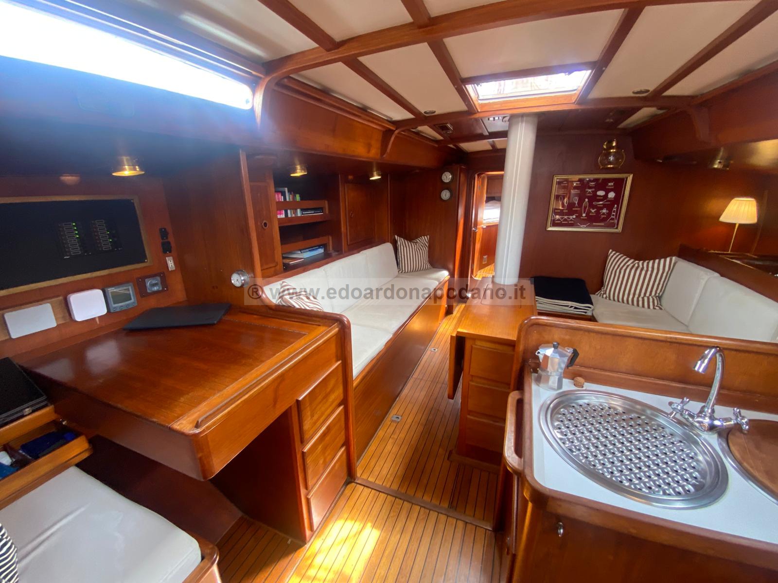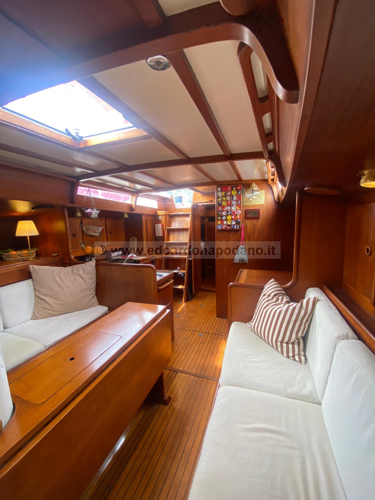 | descrizione interni: | cabina di poppa a due letti grandi, Bagno principale wc man. e doccia, cucina a dx, carteggio a sx, quadrato con due posti letto, cabina singola, bagno con wc elettrico e doccia, cabina di prua. | ||