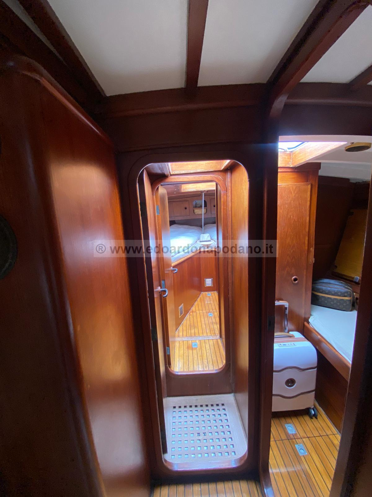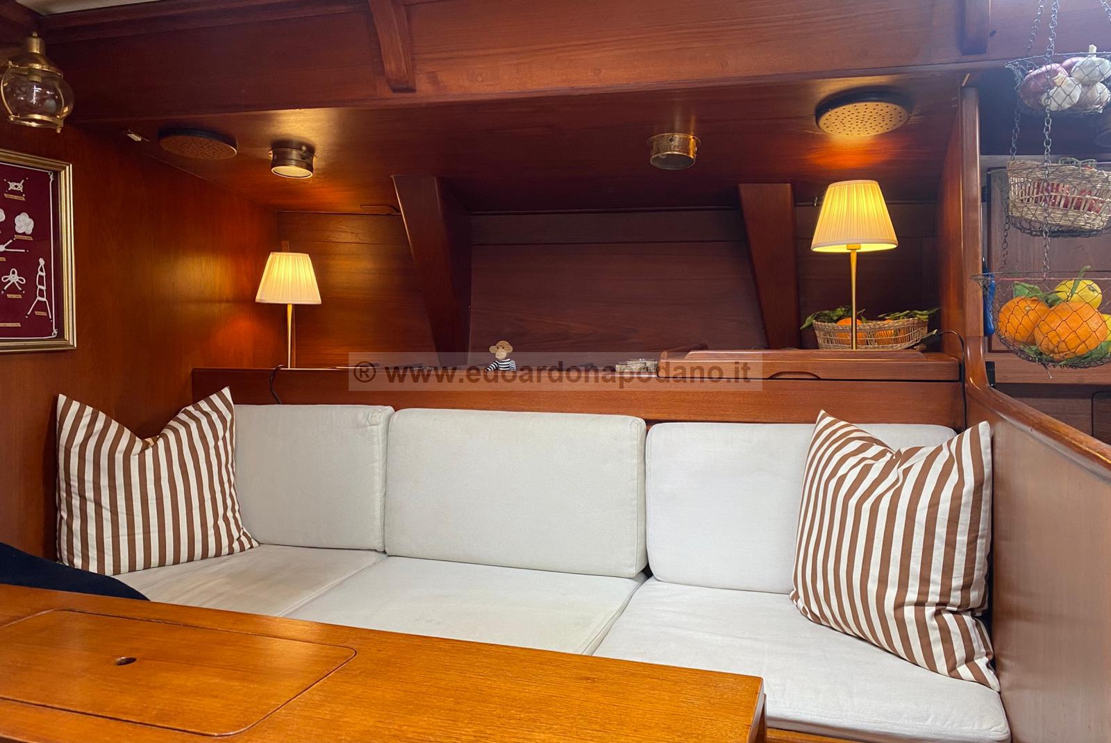 47’ stunning “modern classic” cruiser/racer. Klara was designed by the well appreciated Italian naval architect Carlo Sciarrelli for the Mediterranean sea (the real inventor of new classic style). Built in 1976 she has a cored fiberglass hull, which was very innovative for that time and has proven to be super strong and easy to maintain. Her deck and interior stands in the original teak. Her condition and shape is still as beautiful and iconic as in the 70th thanks to the high quality of teak and the quality of craftsmanship accomplished by the famous F.lli Marchi boatyard in Venice. She is not just a beauty she is also a fast sailing yacht finishing in second and third places in the “Spirit of Tradition” class. Her sails are all new, designed by Zaoli for classic racing. In light winds she runs effortlessly 5,5 knots. When the breeze increases, she accelerates smoothly without any tension. In heavy sea and strong winds at close hauled she is very well balanced and allows you to generate an impressive VMG. On reaching and running you can safely stretch her to her max speed of 8,5 knots before you start reducing your sails. As a summer cruiser she has all the comfort needed for sailing and anchoring in the Med. She is truly a owners version of a sailing yacht with plenty of space for family and friends. 3 cabins, a two person and a one person in the front and the captain’s cabin in the after with plenty of comfort for him and his wife. Her classic style sun cover covering from the cockpit to the mast cools you down and protects you and your guests doing the worm summer days while anchoring in a Mediterranean bay.
