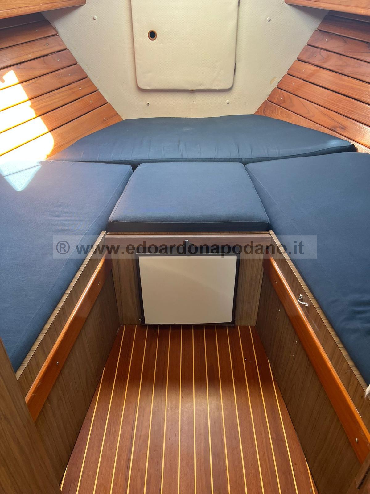 La V di prua è interamente rivestita in doghe di mogano e sotto i lettini è posizionato un frigo